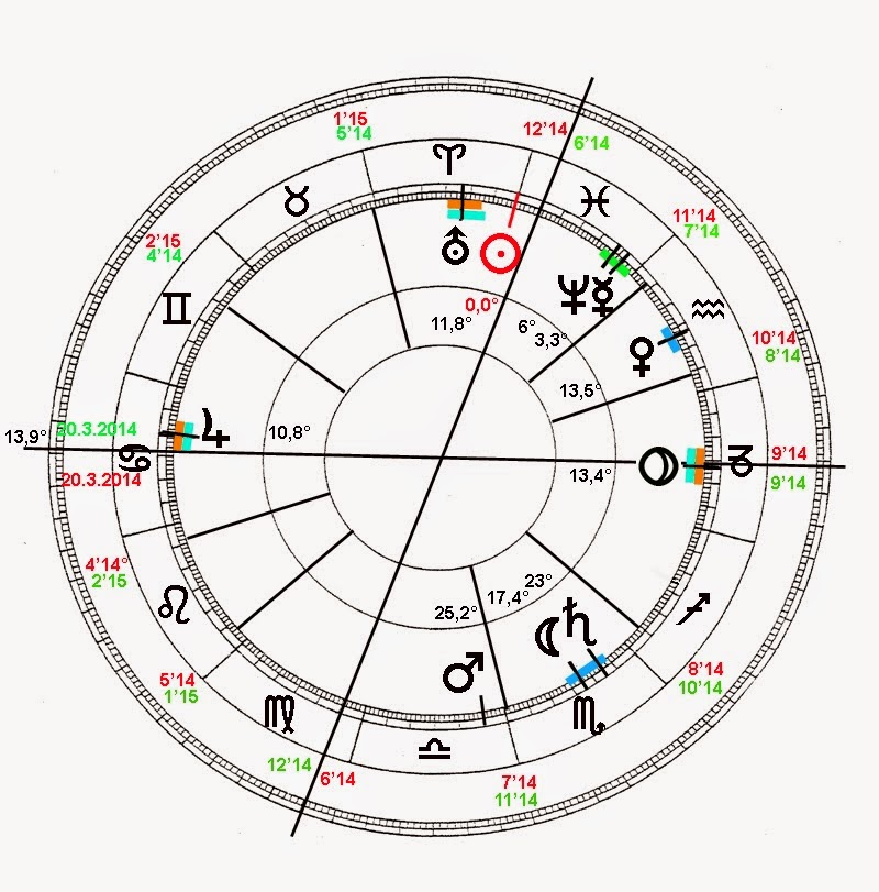 und es kommt für Venus zur jährlichen Einkehr beim grünen Mars - dem Zorn der Meere - auf 0,3° Fische und beim Erdmond - dem unsichtbaren Nest im Wasser der Hingabe - auf 1,6° Fische .